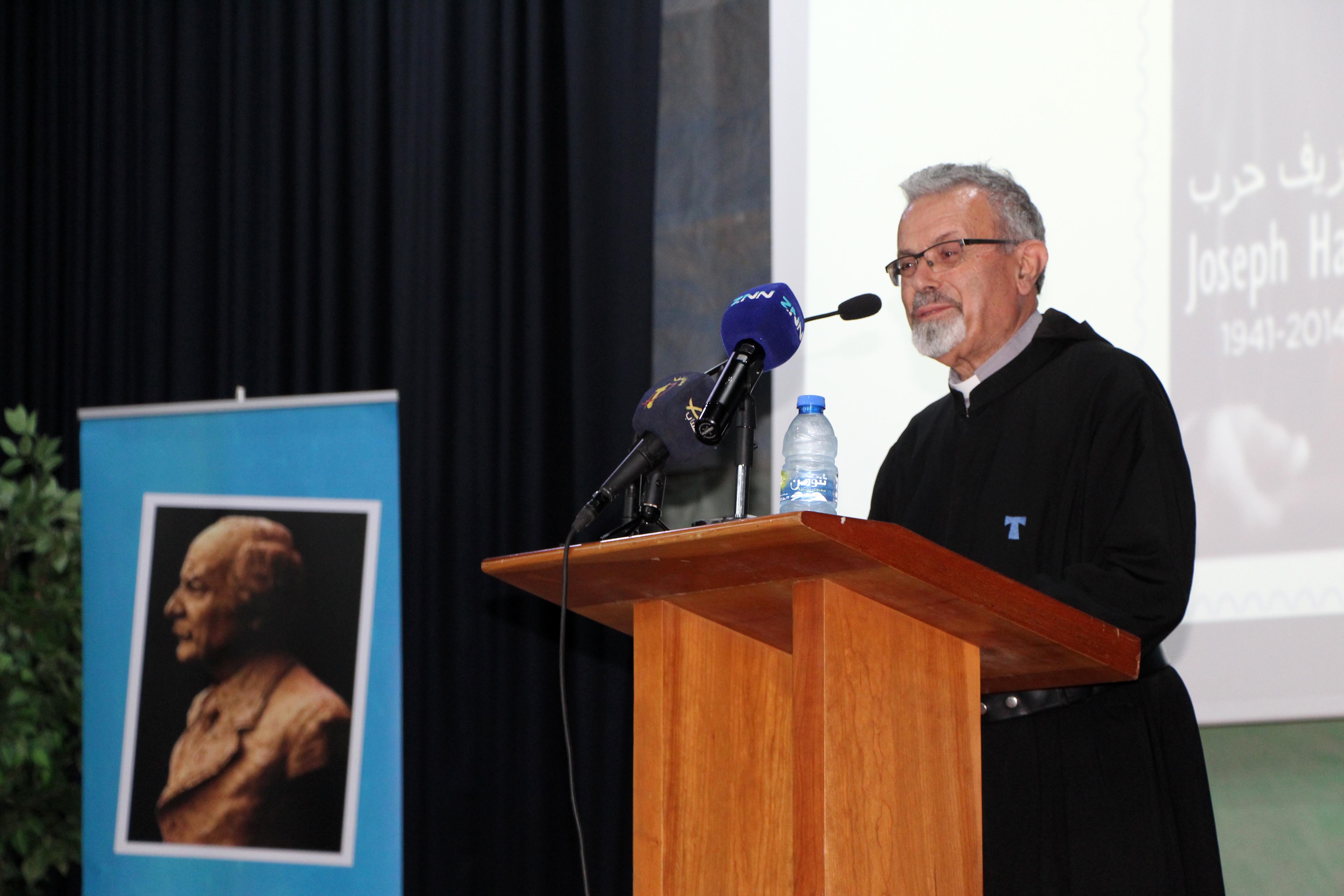 وكانت كلمة للأب الأستاذ بطرس عازار نقل فيها الى منظمي الحفل والحضور تحيات "الرهبانية الأنطونية واسرة دير مار انطونيوس - المعهد الأنطوني لتكريمهم خريج المعهد الشاعر جوزف حرب الذي " كانت أولى ابداعاته الشعرية في أوائل الستينيات وحيث انهى دروسه الثانوية متنشئأ على حب الوطن لبنان والإنسان ، واستكمل هذا الحب لاحقاً بالنضال أيضاً من أجل قضايا العالم العربي العادلة والشهادة للحق الذي يحرر" ، و"ما زالت قصائده وكلماته وترانيمه تحملنا الى عالم الجمال والإبداع وتشدنا الى المراقي.."، منوهاً بكتاب الأب ميشال قنبر " جوزف حرب سمفونية فصول" وآملاً أن "يريح هذا الكتاب فكرنا في زمن الاشاعات والثرثرات والتشويش وان يؤنس حياتنا في زمن القلق والفوضى المتنوعة الوجوه التي تضرب قيمنا وان يعزز انتماءنا الى وطن هو رسالة في زمن المؤامرات عليه وعلى تاريخه وجغرافيته وخصوصيته بأن يكون وطن العيش معا ووطن الحرية ".