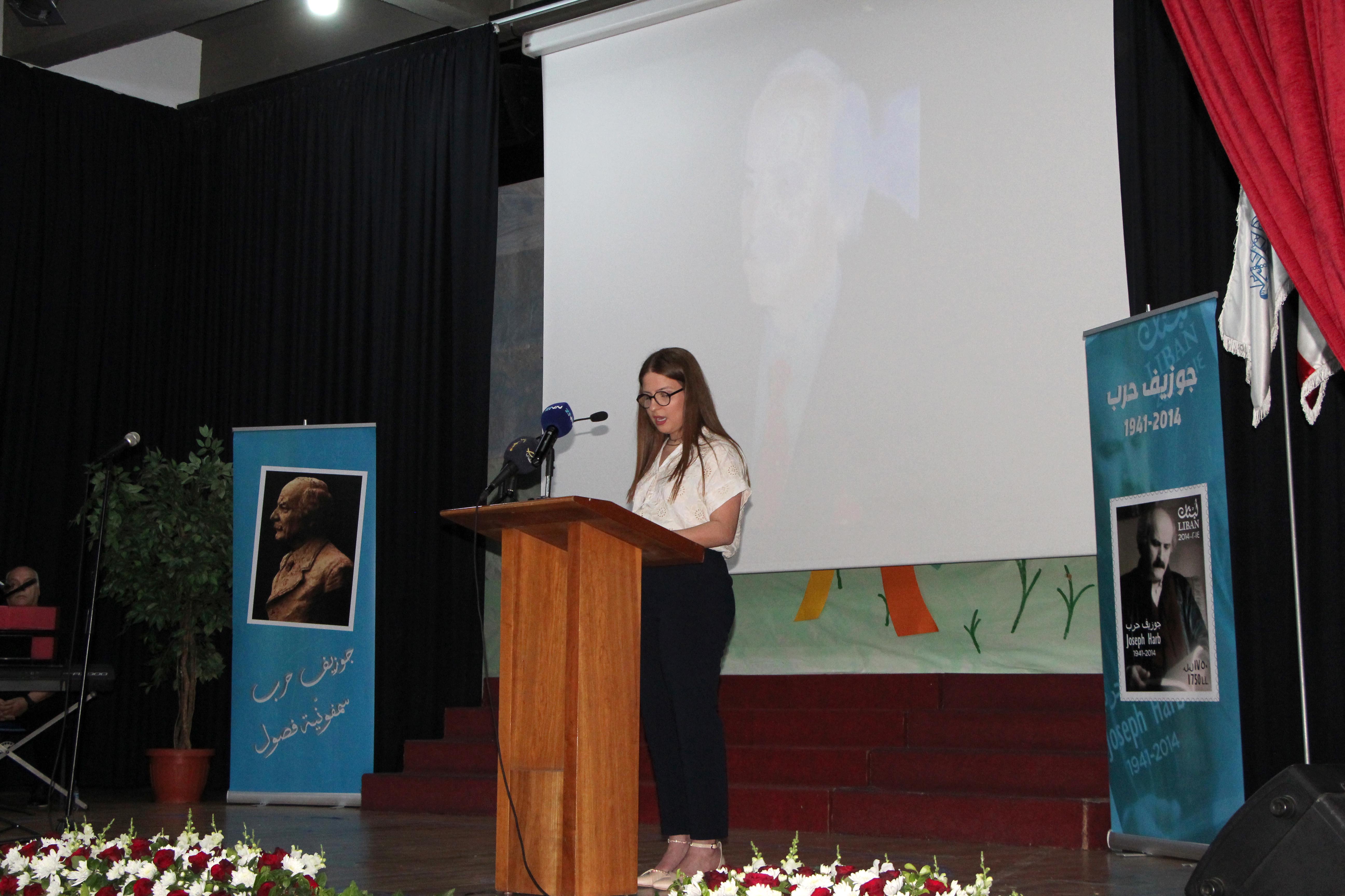 كلمة عائلة الشاعر الراحل جوزف حرب القتها ابنة شقيقه سوميا جاك حرب فقالت " نحن في حضرة شاعر يقيم الآن بيننا ولو بسحر أدبه ، غزا العقول بأدبه ، وبكت المطابع لغيابه . سحرته الكلمة فاصبح ساحرها وانقلب السحر على الساحر .. فصاغ بها إسوارة العروس وتاجاً للجنوب ، واكليل غار لبيروت .. نجتمع اليوم في ذكرى الذي جعل من الغروب شموساً ومن عندلة البلابل صلوات وطقوساً ، لا أجمل منها ولا أبهى وأنتم بكل هذا أعلم مني وادرى . عمي أنت قلت : يا رب نج قصائدي بعد الغياب من التراب .وانا أقول لك : من له هذا الجمهور من الأحباب لن يموت شعره .. لأن قصائدك يا عماه تبر خالد لا يدركه الفساد . أخيرا لا بد من أنحني لأشكركم جميعا لأنكم أحييتم ذكرى من أحببتم . فالشكر لمن دعا ودعم ولكل من حضر وحضر ، حتى لكل من اعتذر . ودمتم جراس الكلمة والنغم .