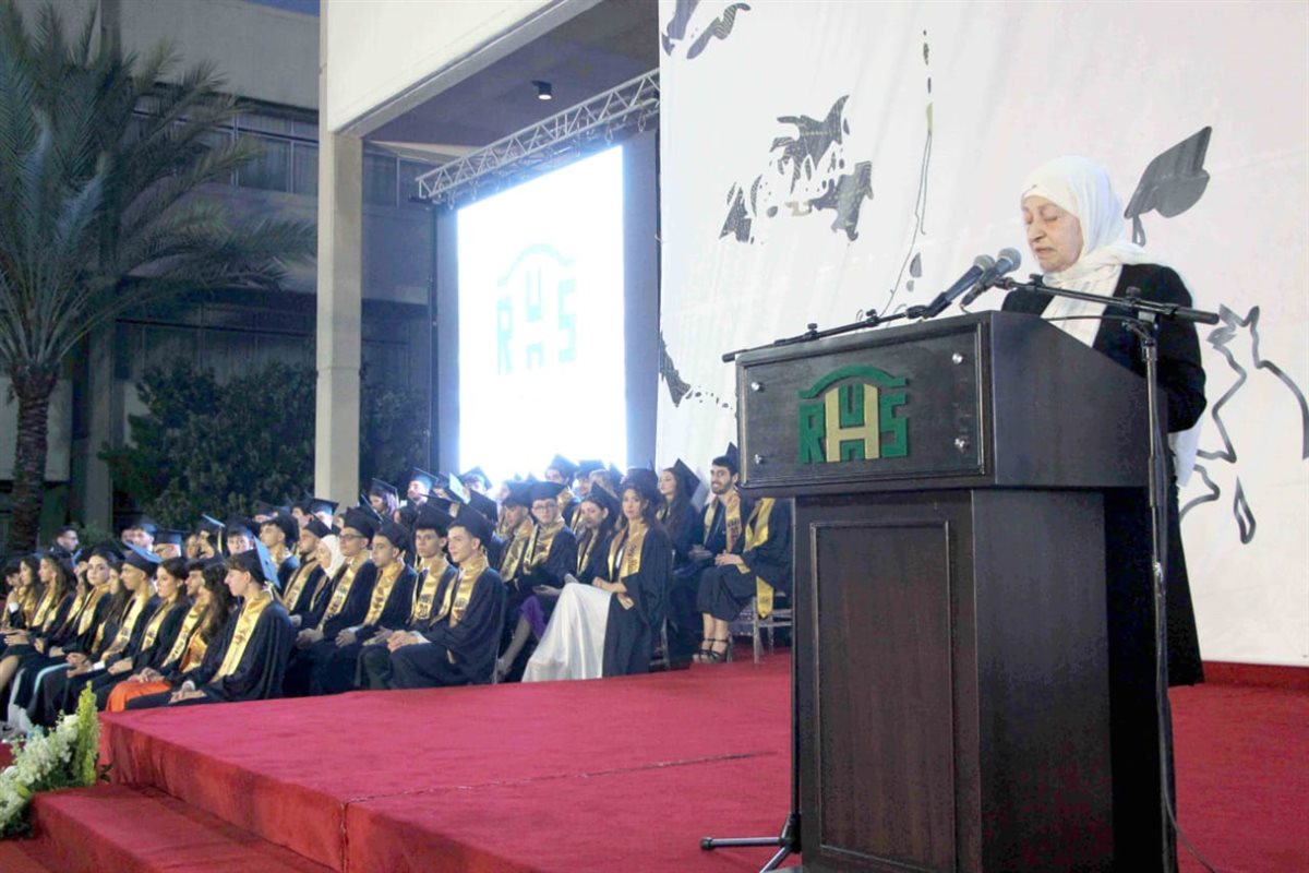 وتحدثت زيدان الحريري فرأت أن" تخرج الدّفعةَ الخامسةَ والثّلاثين من ثانويّة رفيق الحريري، محطّةْ حصادِ زرعِ الأملِ بفضلِ مَنْ فَتَحَ الطّريقَ واسعةً مُضيئةً، وهو الغائبُ الحاضرُ دائمًا الرّئيسُ المؤسّسُ الشّهيد رفيق الحريري، الّذي آمَنَ وقالَ وفَعَلَ ما ردّدَهُ على الدّوام: "إنّ بناءَ المستقبلِ الزّاهرِ لا يكونُ إلّا عَبرَ تعليمِ الشّبابِ وتمكينِهم وَزَرعِ الأملِ في نفوسِهم"، شاكرة للحريري" الّتي تتخطّى جراحَها لتكونَ نموذجَنا في الصّبرِ، ومتابعةِ العملِ بأملْ لأنّ شُغلَها الشّاغل هو أمانةُ الطّلّابِ والطّالباتِ، والبحث عن تقديمِ الأفضلِ والأنسبِ والنّوعيِّ في عالمِ التّربيةِ والتّعليمِ للإرتقاءِ بجودِتِه". معربة عن تقديرها لجهدِ وتفاني أفراد الهيئتيْن التّعليميّةِ والإداريّةِ وكلِّ العاملين في المدرسة، ومهنئةً الأهالي الذين بذلوا الغالي والنّفيسَ، ودعموا وشجّعوا وتشاركوا معَ المدرسة لتشكيلِ ملامحِ مُتعلّمِ ثانويّةِ رفيق الحريري".