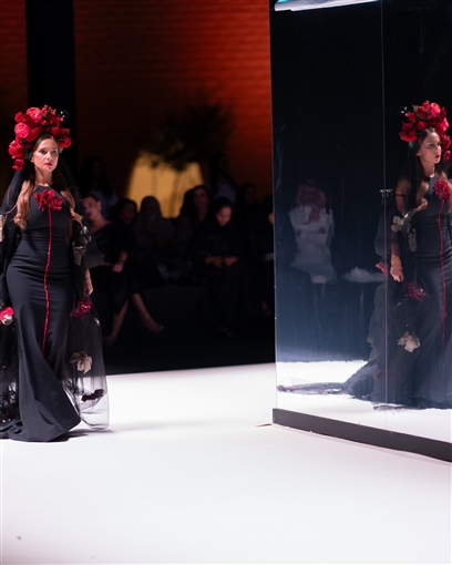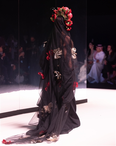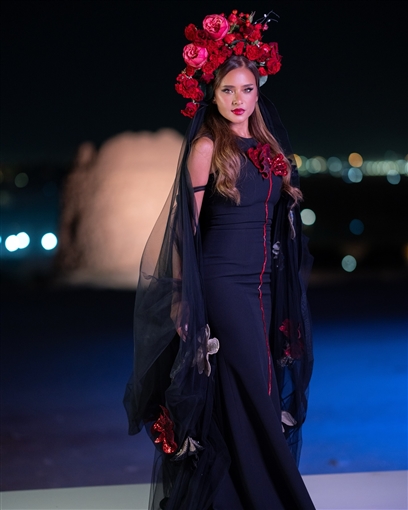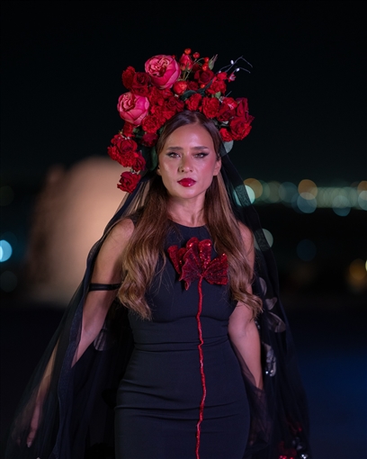 بالصور : بفستان أسود وتاج من الورود … نيللي كريم تشارك في أسبوع الموضة بالرياض