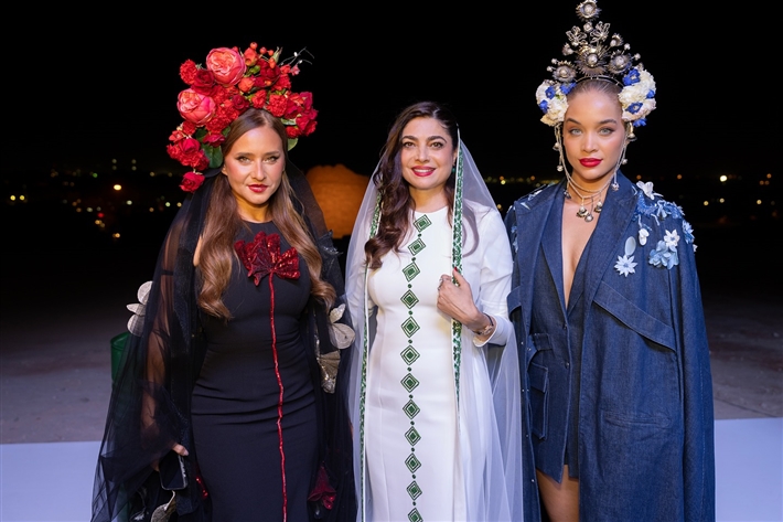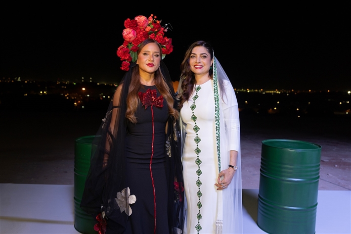 أطلت نيللي كريم في أول أيام أسبوع الموضة بالرياض بفستان من تصميم المصممة السعودية هنيدة صيرفي، التي تستوحي تصاميمها من التراث السعودي.