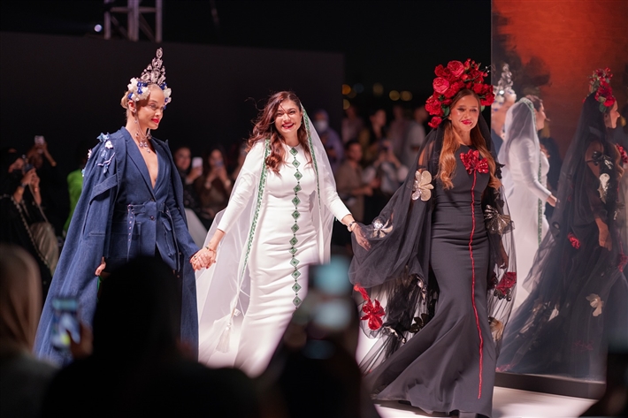 وعبرت نيللي كريم عن سعادتها بمشاركتها في العرض وتمنت للمصممة هنيدة صيرفي المزيد من التألق والنجاح.