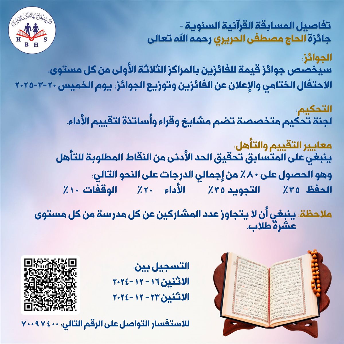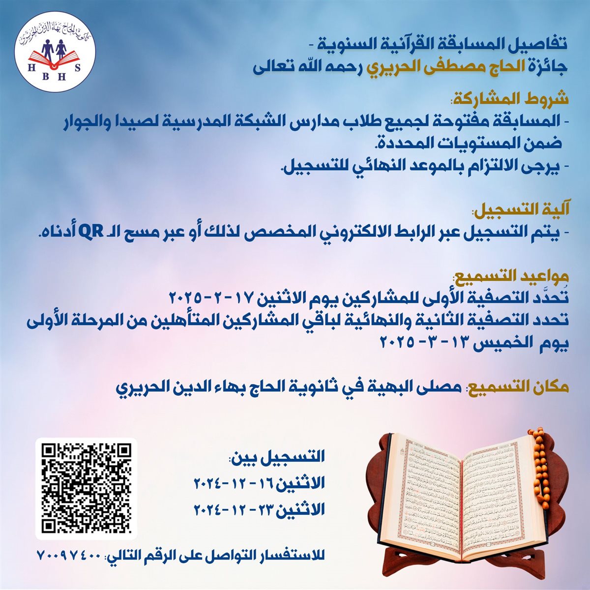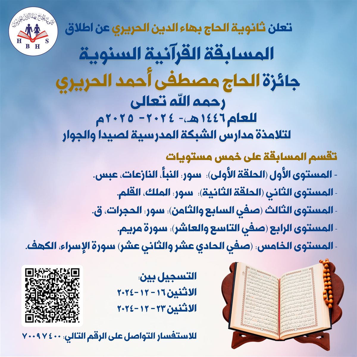 أعلنت "ثانوية الحاج بهاء الدين الحريري" عن إطلاق "المسابقة القرآنية السنوية – جائزة المرحوم الحاج مصطفى أحمد الحريري" للعام 1446 هـ/2024-2025.