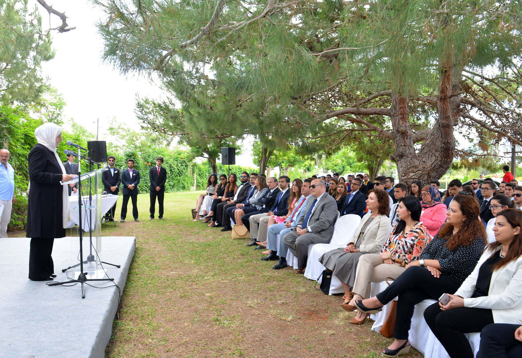 واضافت : إنّنا إذ نعتز بنجاحكم وتفوّقكم.. نعلّق الآمال الكبار عليكم.. لكي تحفظوا وطنكم ورسالته في الإنفتاح والتّنوّع داخل الوحدة الوطنية والعائلة اللبنانية الكبيرة..وإنّنا في الأيام القادمة سنحتفل بالذكرى الخامسة والتّسعين لإعلان دولة لبنان الكبير جمهورية العلم والتربية والثقافة والأخوّة والصّداقة، جمهورية التجربة الوطنية العريقة.. رغم كلّ التّحديات والمعوقات .. وإنّنا إذ نتألّم معكم لعدم إنتخاب رئيسٍ للجمهورية حتى الآن وانتظام الحياة السياسية بما يضمن إستقرار دولتكم ومستقبلكم الآمن والمزدهر.. إلاّ أنّ ثقتنا كبيرة بأنّ اللبنانيين سيتجاوزون هذه المحنة.. وسيعود لبنان دولة مستقلة فاعلة.. ومؤسّسة للأمم المتحدة .. ولجامعة الدول العربية.. ومساهمة في صياغة الشرعة العالمية لحقوق الإنسان.. وإذ أتوجّه بالشّكر والتقدير للجامعة اللبنانية الأميركية ورئيسها الدكتور جوزيف جبرا .. فإنّني أنوّه بتفاني الدكتور إيلي سميا في رعايته هذا البرنامج ومتابعته في أدقّ التّفاصيل .. ولقد خرجنا جميعاً من لقاء تخرّجكم الأخير وكلّنا فخر واعتزاز لما سمعناه منكم .. وشعرنا بالطمأنينة على مستقبل لبنان بعلمكم واجتهادكم وثقافتكم الواسعة.. وإنّنا في مؤسسة الحريري للتنمية البشرية المستدامة نعتزّ بهذه الشّراكة مع برنامج نموذج جامعة الدول العربية.