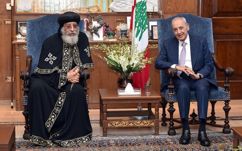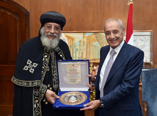 استقبل رئيس مجلس النواب نبيه بري، بعد ظهر اليوم في عين التينة، بابا الإسكندرية وبطريرك الكرازة المرقسية تواضروس الثاني، على رأس وفد من الكنيسة، والسفير المصري نزيه نجاري، ودار الحديث حول التطورات في المنطقة والعلاقات بين لبنان ومصر، وحول "جو الإعتدال والعيش المشترك والتسامح السائد في كل من البلدين"، كذلك "الخطى العملية بين الأزهر الشريف والكنيسة في مصر في سبيل الأجيال الطالعة التي تعبر عن حقيقة الأديان التسامحية".
