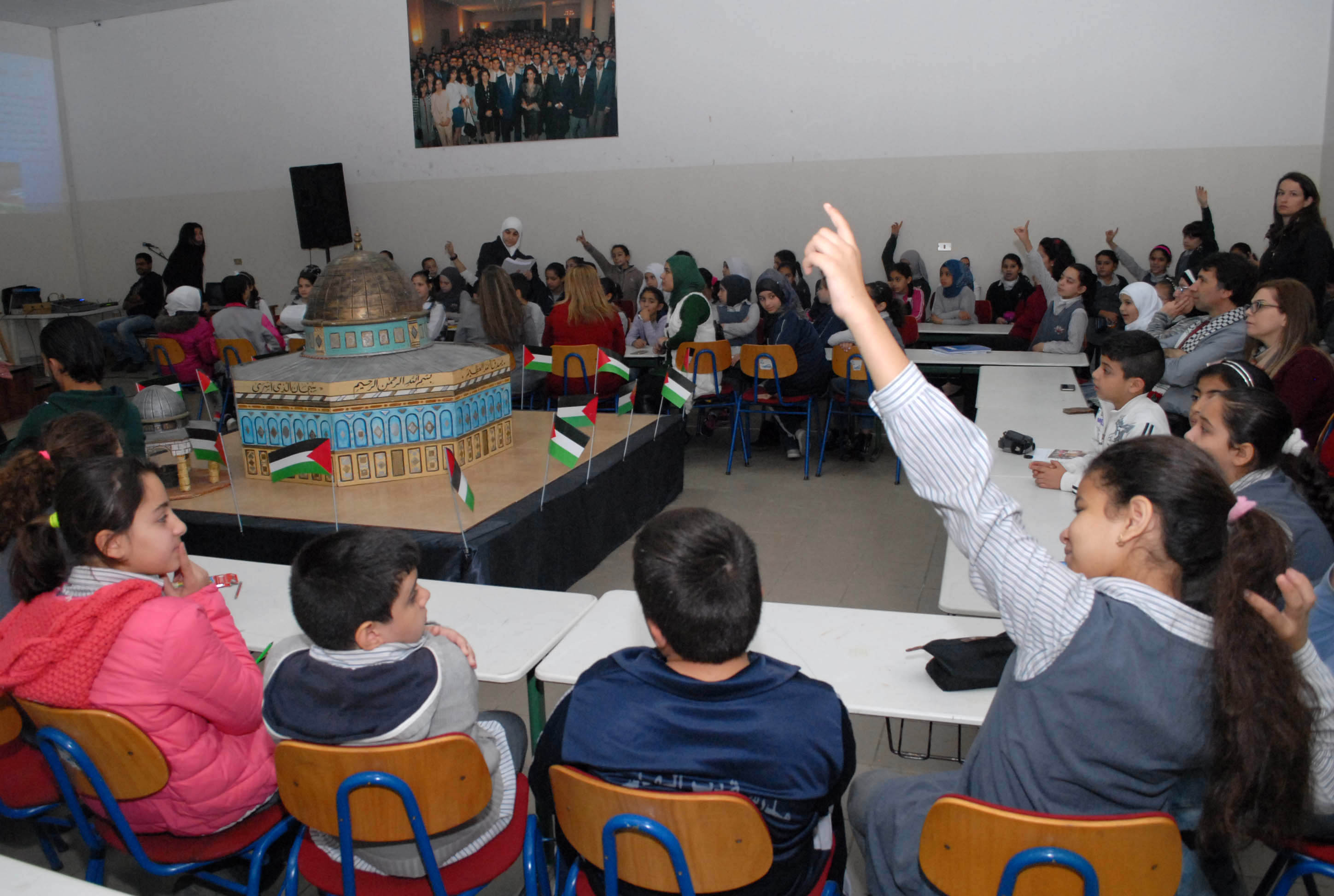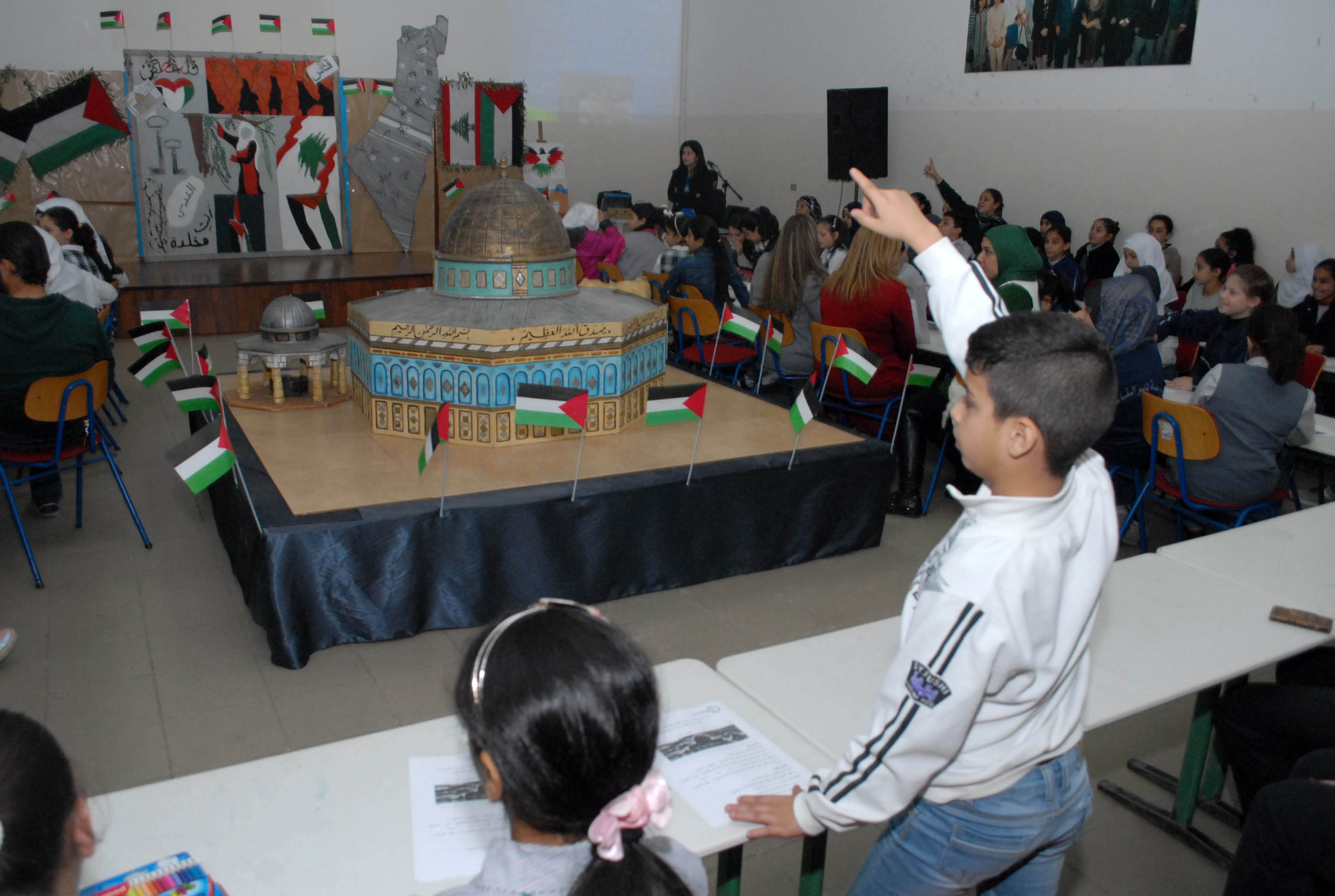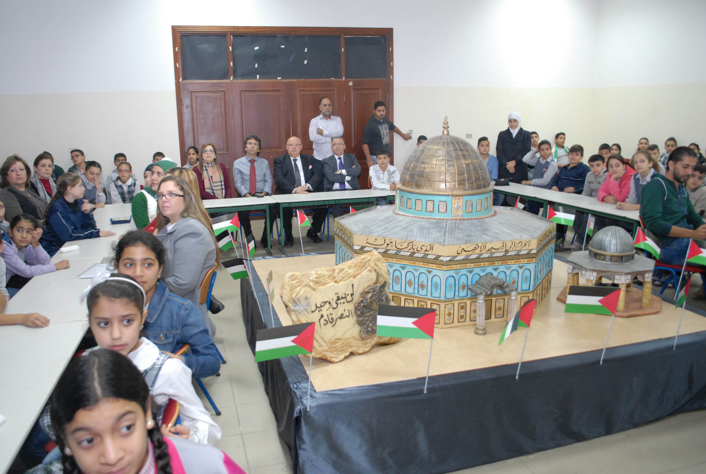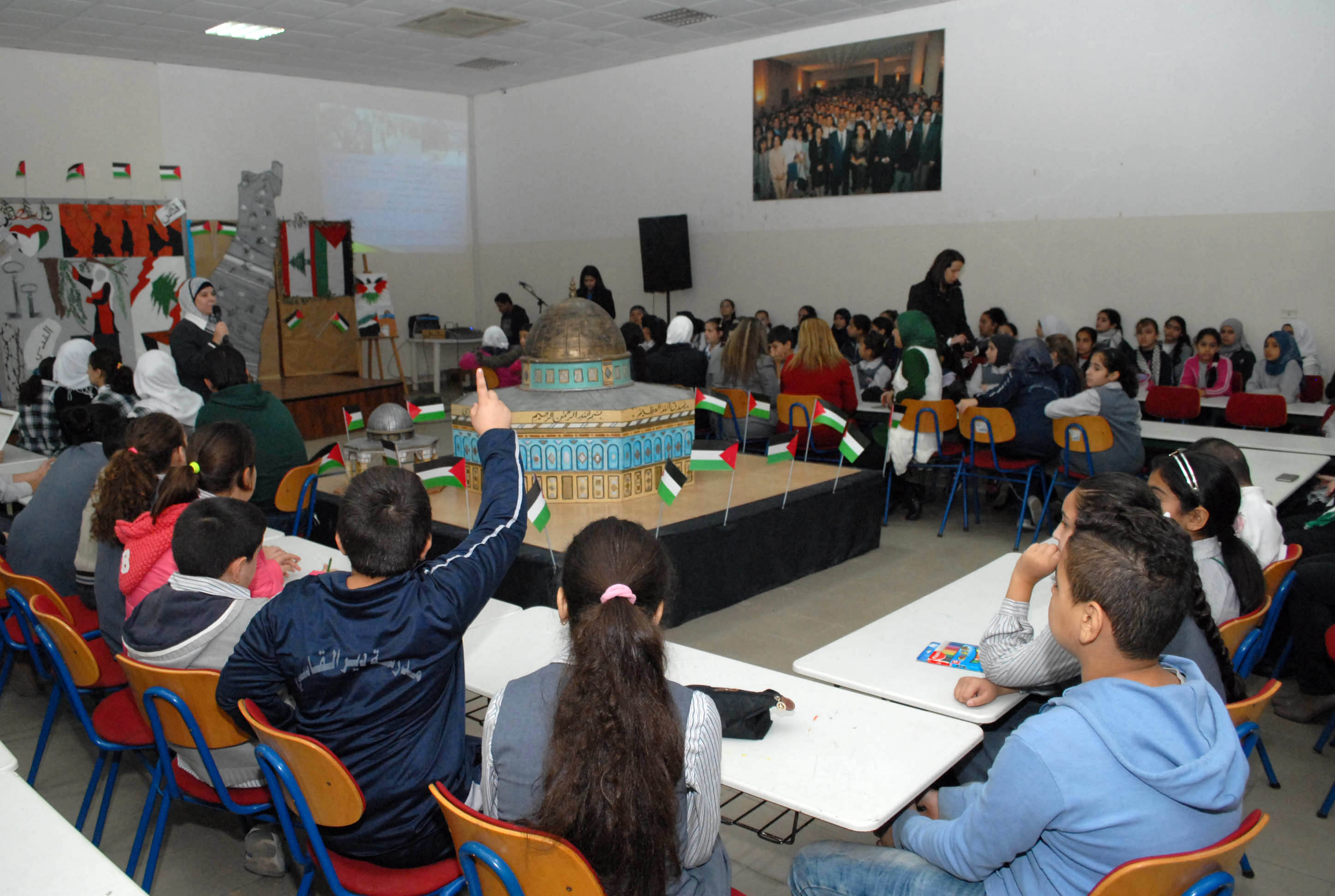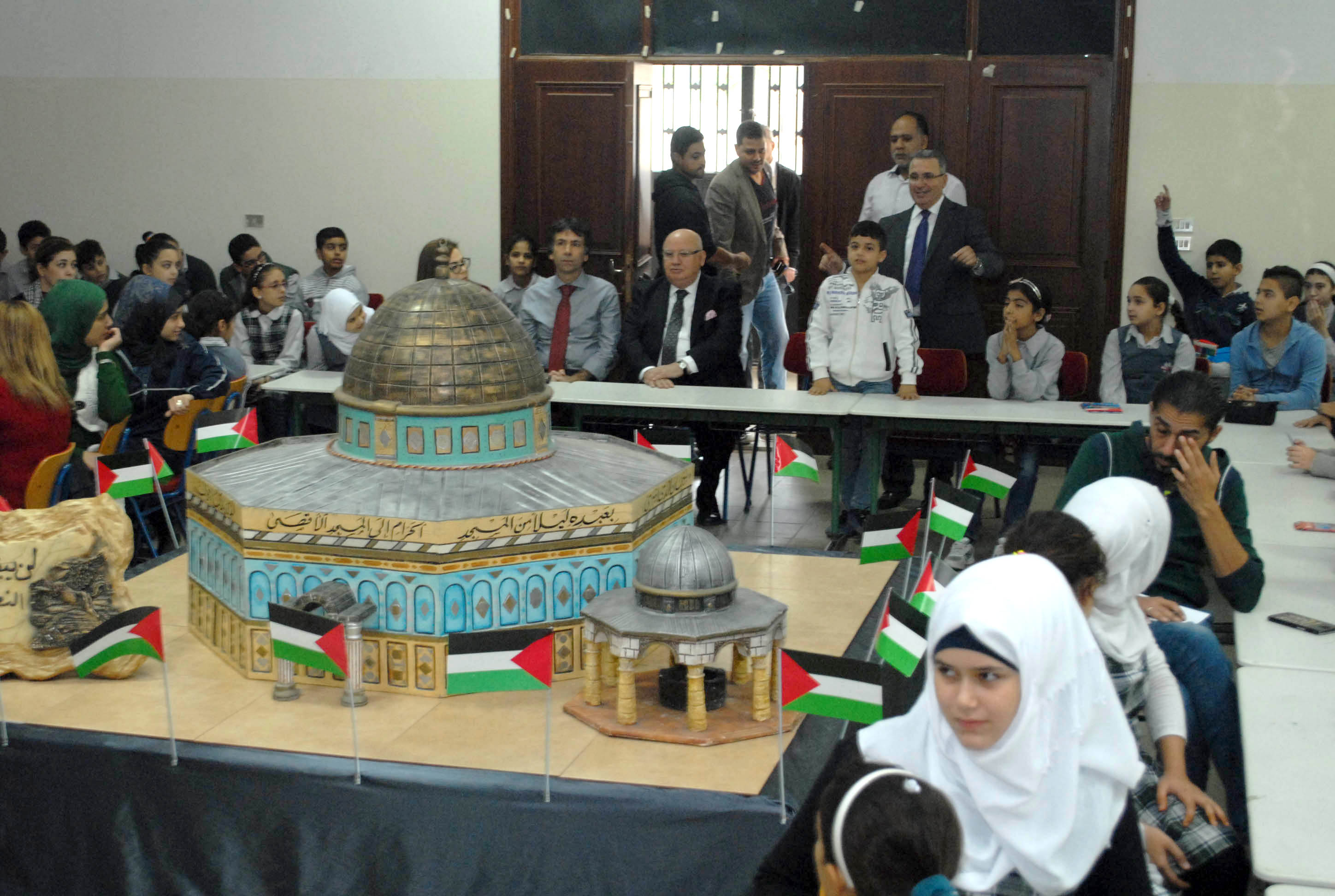 تحلق الطلاب اللبنانيون والفلسطينيون المشاركون حول مجسم للأقصى وقبة الصخرة توسط قاعة مجمع بهاء الدين الحريري الانمائي وهم يستمعون الى شروحات من معلمتي التربية الوطنية والدينية حول موضوع درسهم الاستثنائي انطلاقا من ورقة عمل وزعتها الشبكة المدرسية عليهم وتضمنت اسئلة تاريخية وجغرافية ودينية حول القدس، طلب منهم الاجابة عليها والتعبير كتابة ورسما عن تضامنهم مع القضية الفلسطينية .