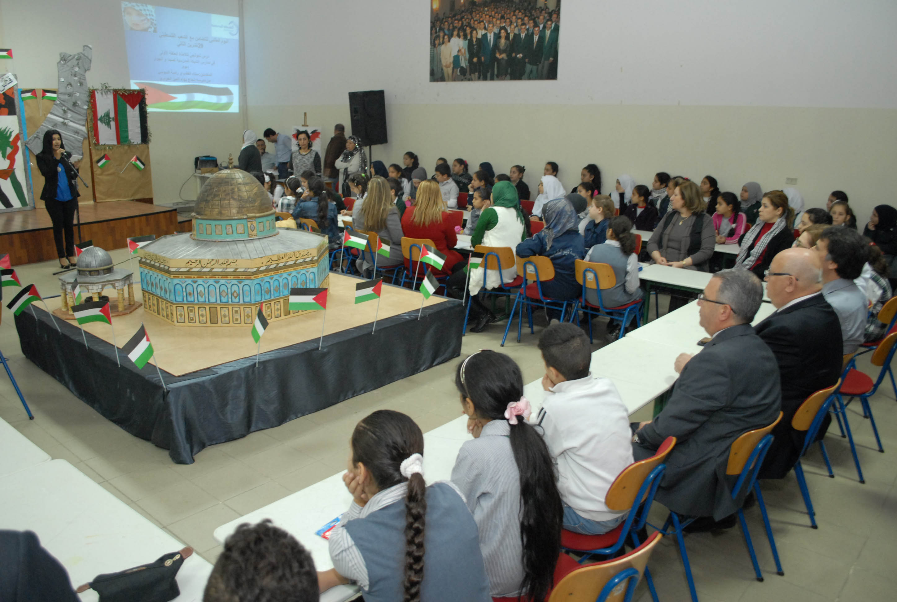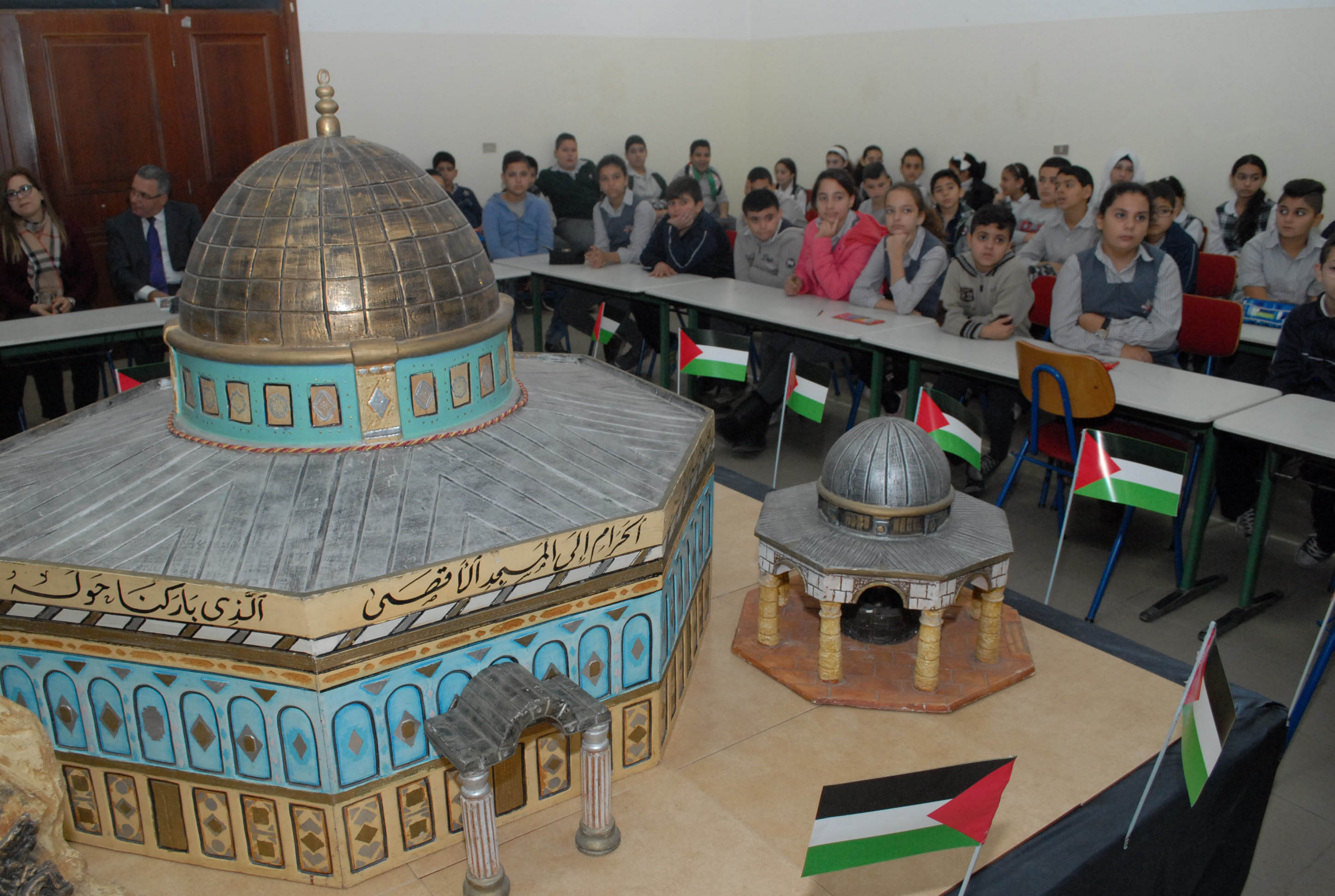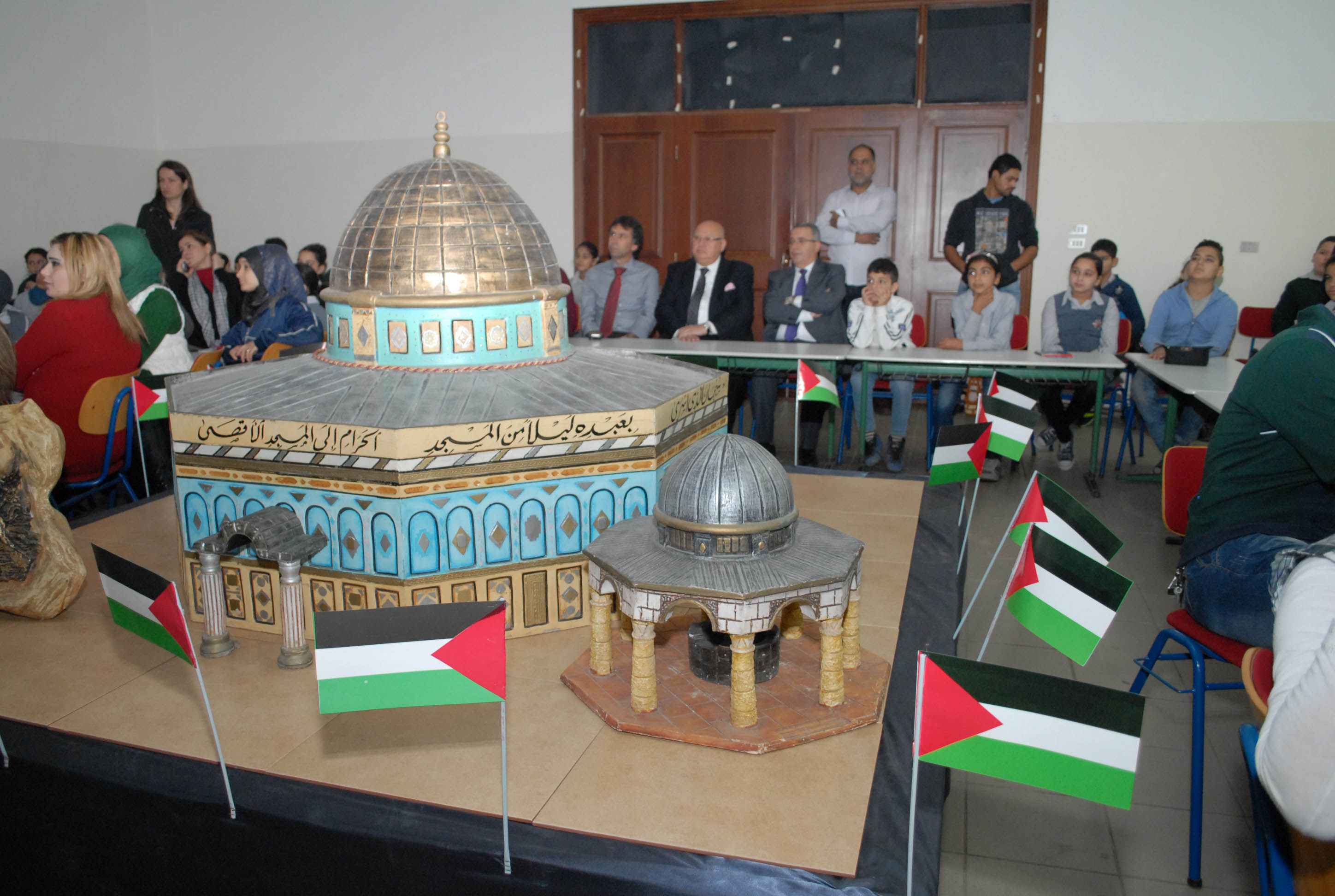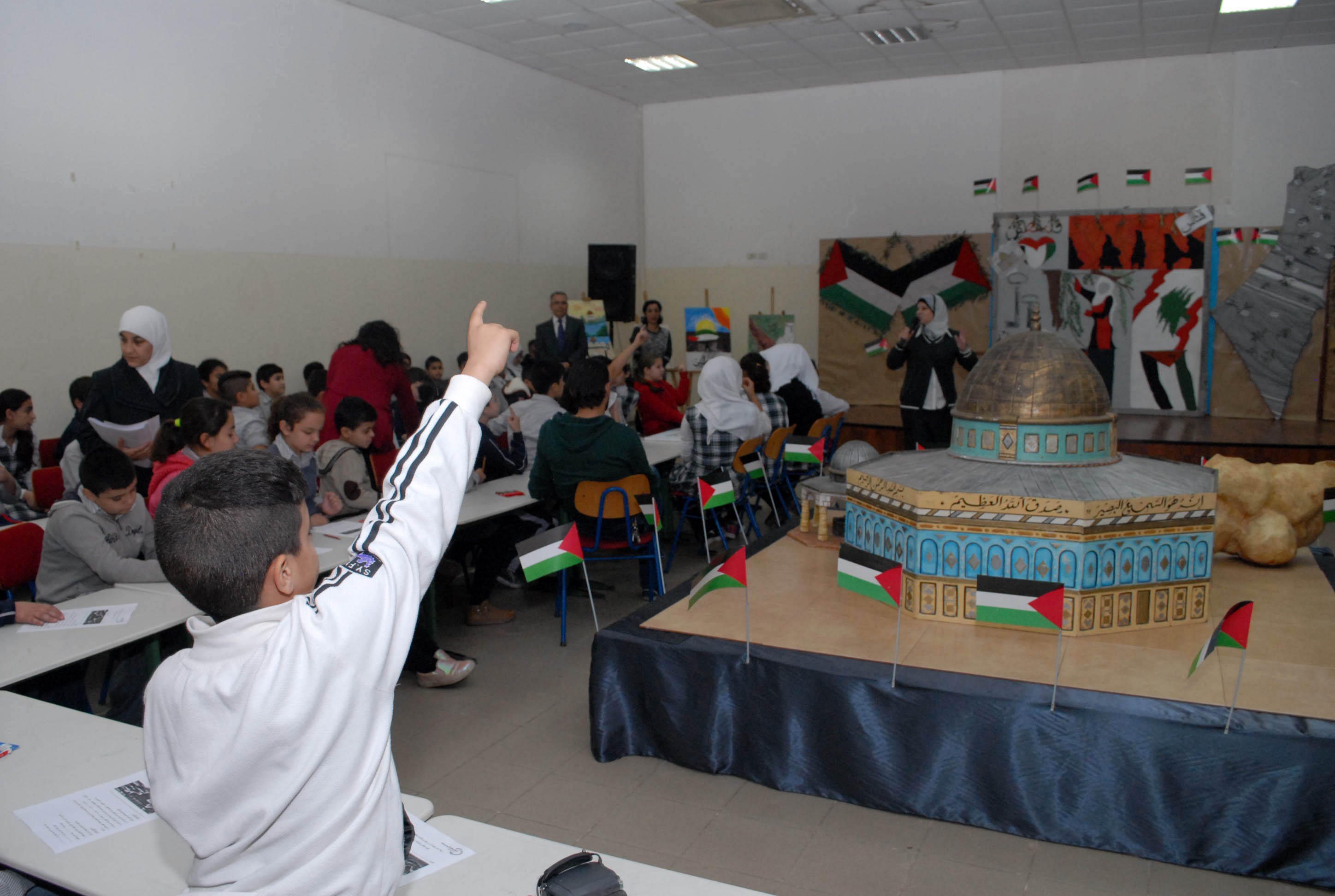تحلق الطلاب اللبنانيون والفلسطينيون المشاركون حول مجسم للأقصى وقبة الصخرة توسط قاعة مجمع بهاء الدين الحريري الانمائي وهم يستمعون الى شروحات من معلمتي التربية الوطنية والدينية حول موضوع درسهم الاستثنائي انطلاقا من ورقة عمل وزعتها الشبكة المدرسية عليهم وتضمنت اسئلة تاريخية وجغرافية ودينية حول القدس، طلب منهم الاجابة عليها والتعبير كتابة ورسما عن تضامنهم مع القضية الفلسطينية .