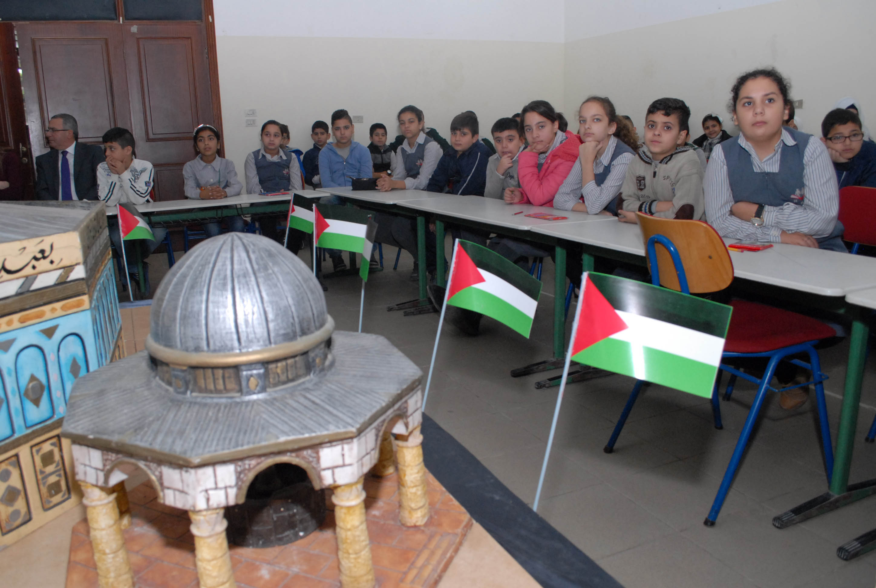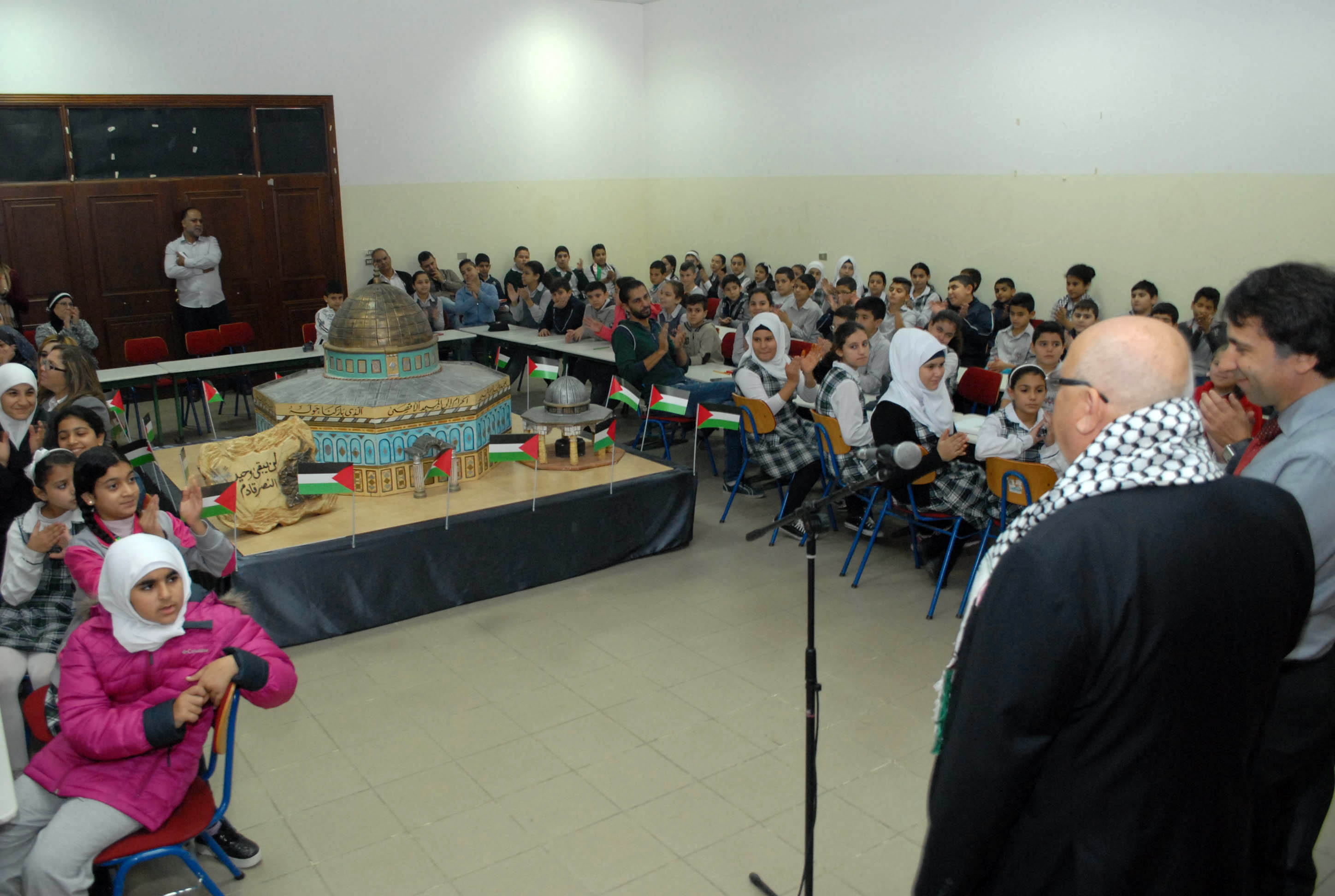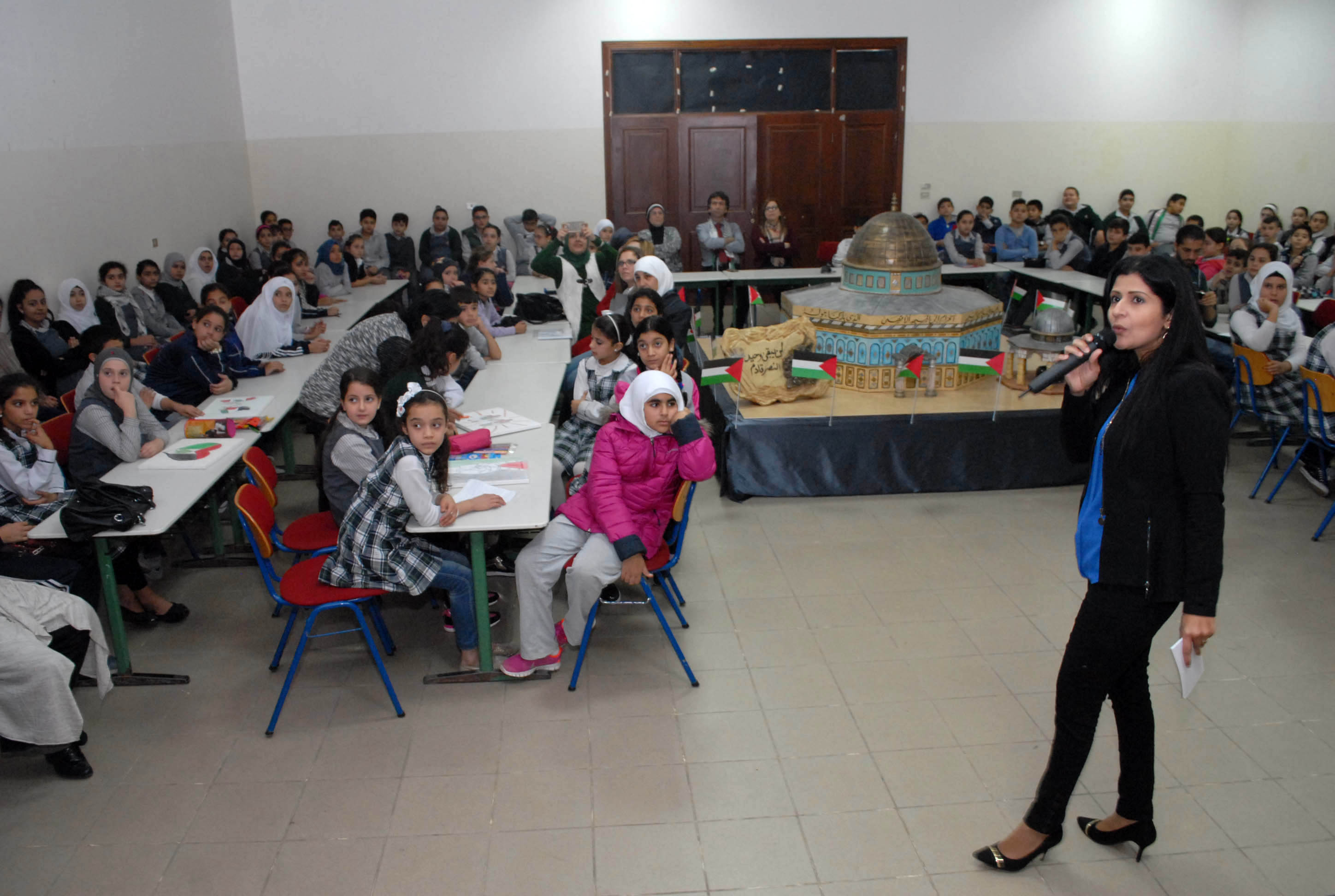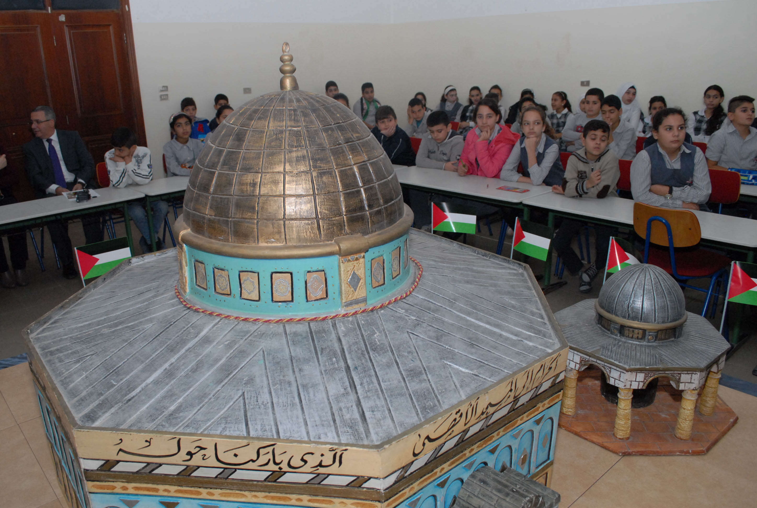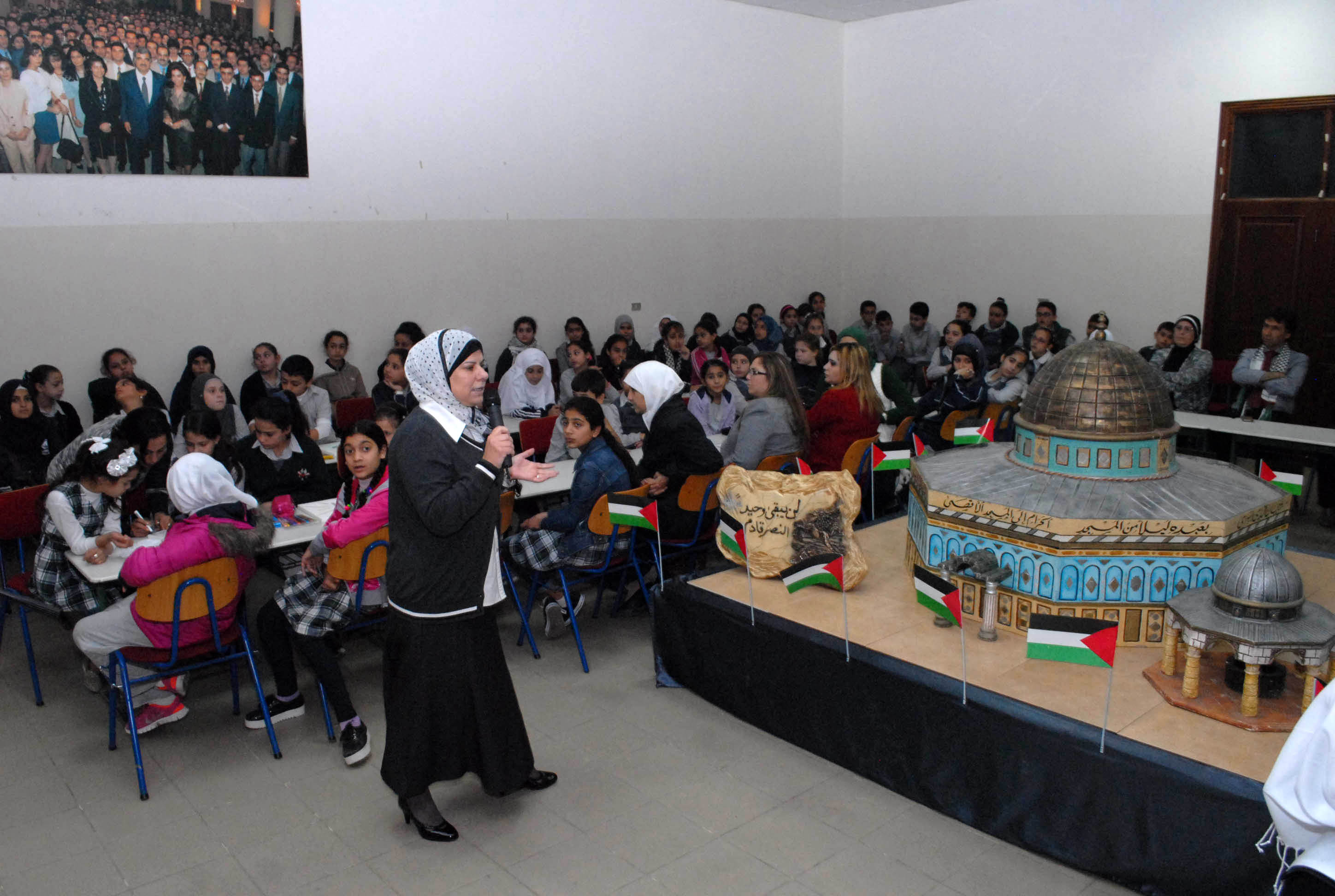 تحلق الطلاب اللبنانيون والفلسطينيون المشاركون حول مجسم للأقصى وقبة الصخرة توسط قاعة مجمع بهاء الدين الحريري الانمائي وهم يستمعون الى شروحات من معلمتي التربية الوطنية والدينية حول موضوع درسهم الاستثنائي انطلاقا من ورقة عمل وزعتها الشبكة المدرسية عليهم وتضمنت اسئلة تاريخية وجغرافية ودينية حول القدس، طلب منهم الاجابة عليها والتعبير كتابة ورسما عن تضامنهم مع القضية الفلسطينية .
