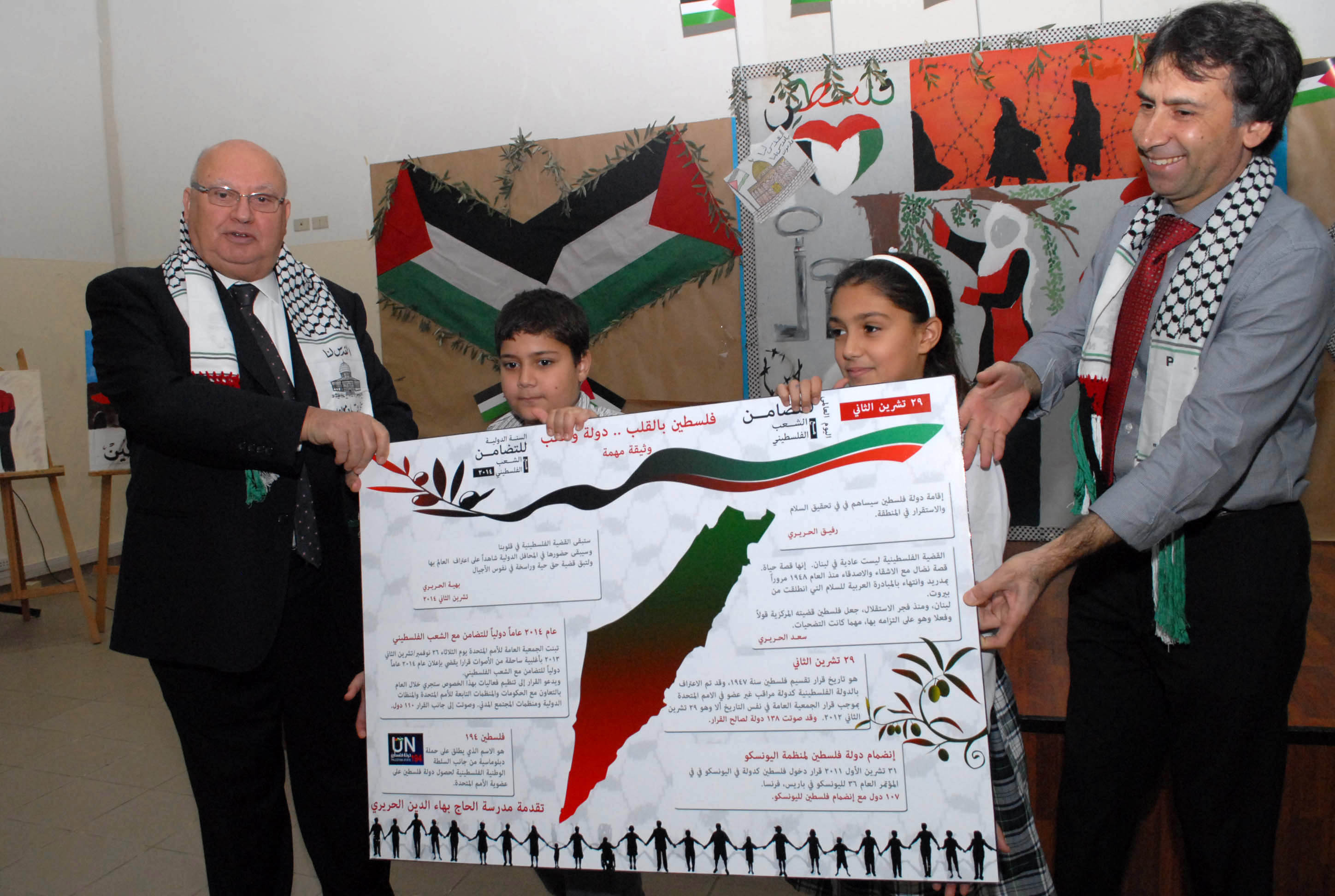 لمناسبة اليوم العالمي للتضامن مع الشعب الفلسطيني ودعما لإنتفاضته المباركة ضد الاحتلال الإسرائيلي خصصت الشبكة المدرسية لصيدا والجوار هذه المناسبة بدرس نموذجي موحد لطلابها عن القدس وفلسطين في جميع مدارس الشبكة، حيث قام معلمو ومعلمات التربية الوطنية والدينية بشرح تاريخ فلسطين والقدس وما تختزنه من تراث روحي وانساني، واستعراض المراحل التي مرت بها قضية الشعب الفلسطيني منذ النكبة وحتى اليوم والانتفاضات الفلسطينية ضد الاحتلال دفاعا عن الأرض والمقدسات بوجه الاحتلال والتهويد الاسرائيلي .