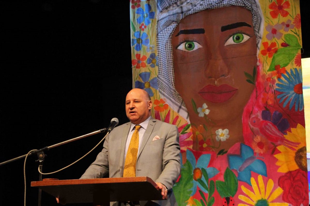 وقال :" واليوم ومن خلالها سفيرتنا للفن والإبداع الأستاذة فاطمة التي هي أم ومدرسة ، وكل أم هي مدرسة .. نعتبر ان ما تقوم به هو شكل من أشكال النضال بالفن ، لأن هذه اللوحة ستخرج الآن الى فضاء التواصل الإجتماعي وتجول العالم وسيكون لها صدى كما صدى البندقية في الميدان . ونحن لا بد ان نقف الى جانب هذه الأقلام لنوصل رسالتنا للعالم بأن فلسطين ستعود للفلسطينيين كاملة بإذن الله ، وأن هذا الجيل سيحمل الراية وسيناضل طالما نزرع فيهم روح الدفاع عن الحق ممثلاً بالقضية الفلسطينية والانتصار لها ، وبفضل هذا الجيل ستنتقل الراية الى الأجيال القادمة وستظل فلسطين في قلب كل انسان في العالمي العربي والإسلامي بل وفي العالم وقد رايتم كيف ثار طلاب جامعات العالم وفي كبرى المدن الغربية استنكاراً لما يتعرض له الشعب الفلسطيني ، وكيف يتزايد عدد الدول التي تعترف بدولة فلسطين .