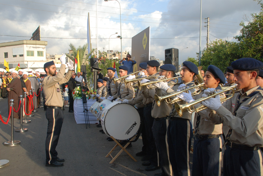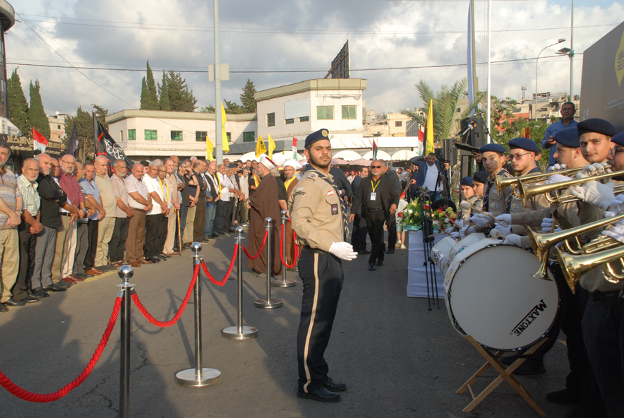 كما ألقى السيد ياسر عباس الموسوي كلمة بالمناسبة بعدها تمت إزاحة الستار عن الجدارية ووضع إكليل من الزهر وأداء القسم عهدا للقادة الشهداء ورفع راية فلسطين تعبيرا عن بوصلة المقاومة نحو القدس.