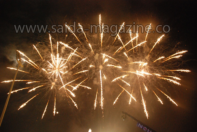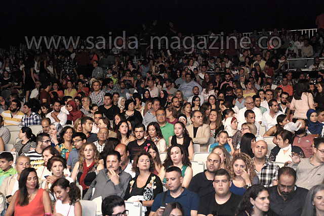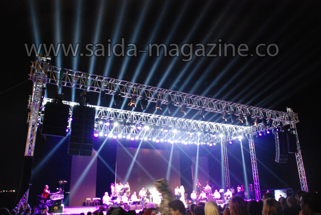 وفور بدء الحفل اشتعلت سماء المنطقة بالمفرقعات النارية احتفاء واطلت الفنانة نانسي عجرم حاملة العلم اللبناني تغني اغنية "بحبك يا لبنان تتخلص الدني "قبل ان ترخب بالحاضرين والجمهور وقالت : سعيدة جدا لوجودي في صيدا ووجودنا الليلة دليل على محبتنا للبنان ومادام اننا جميعا نحب لبنان فلا خوف على لبنان ..