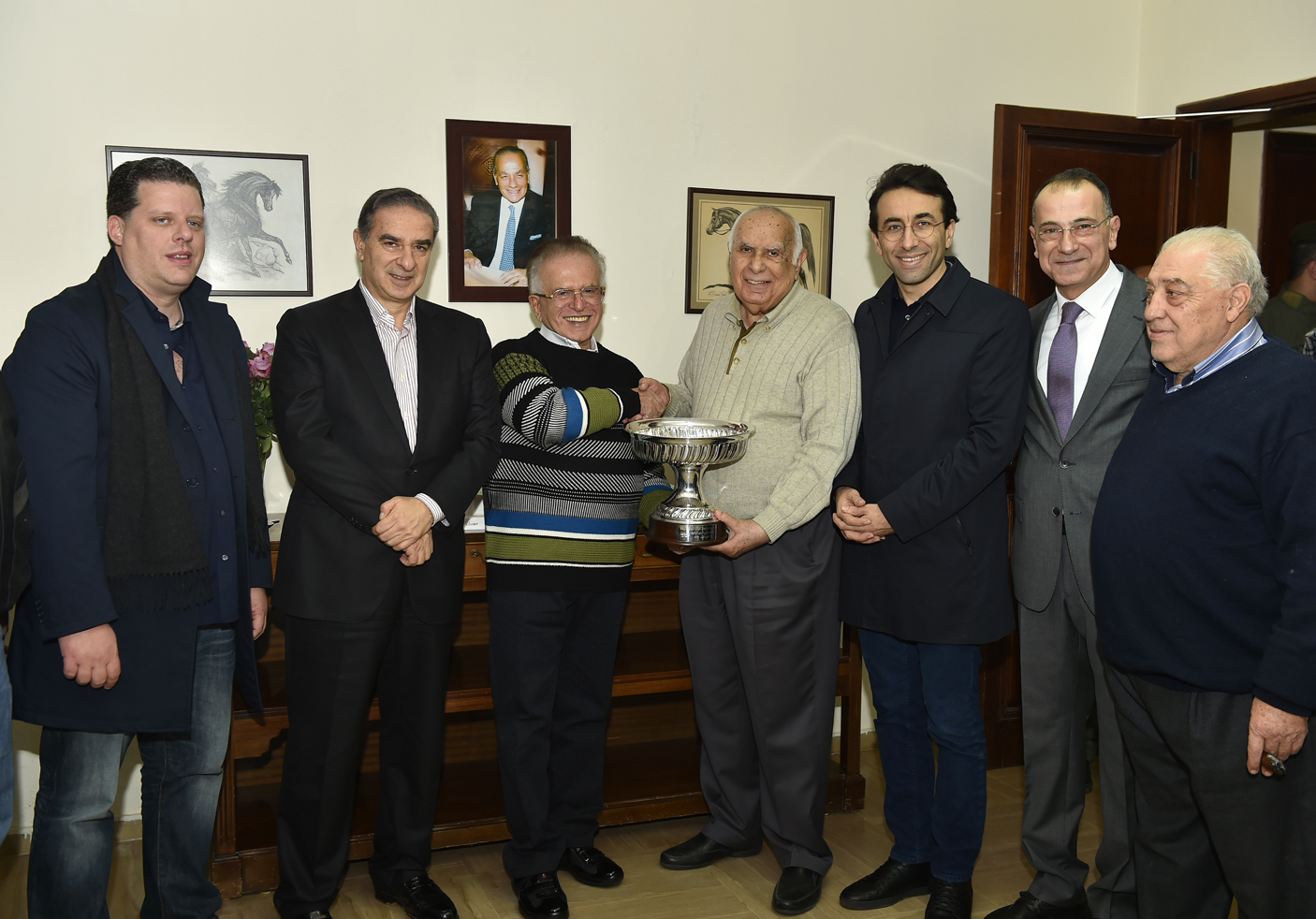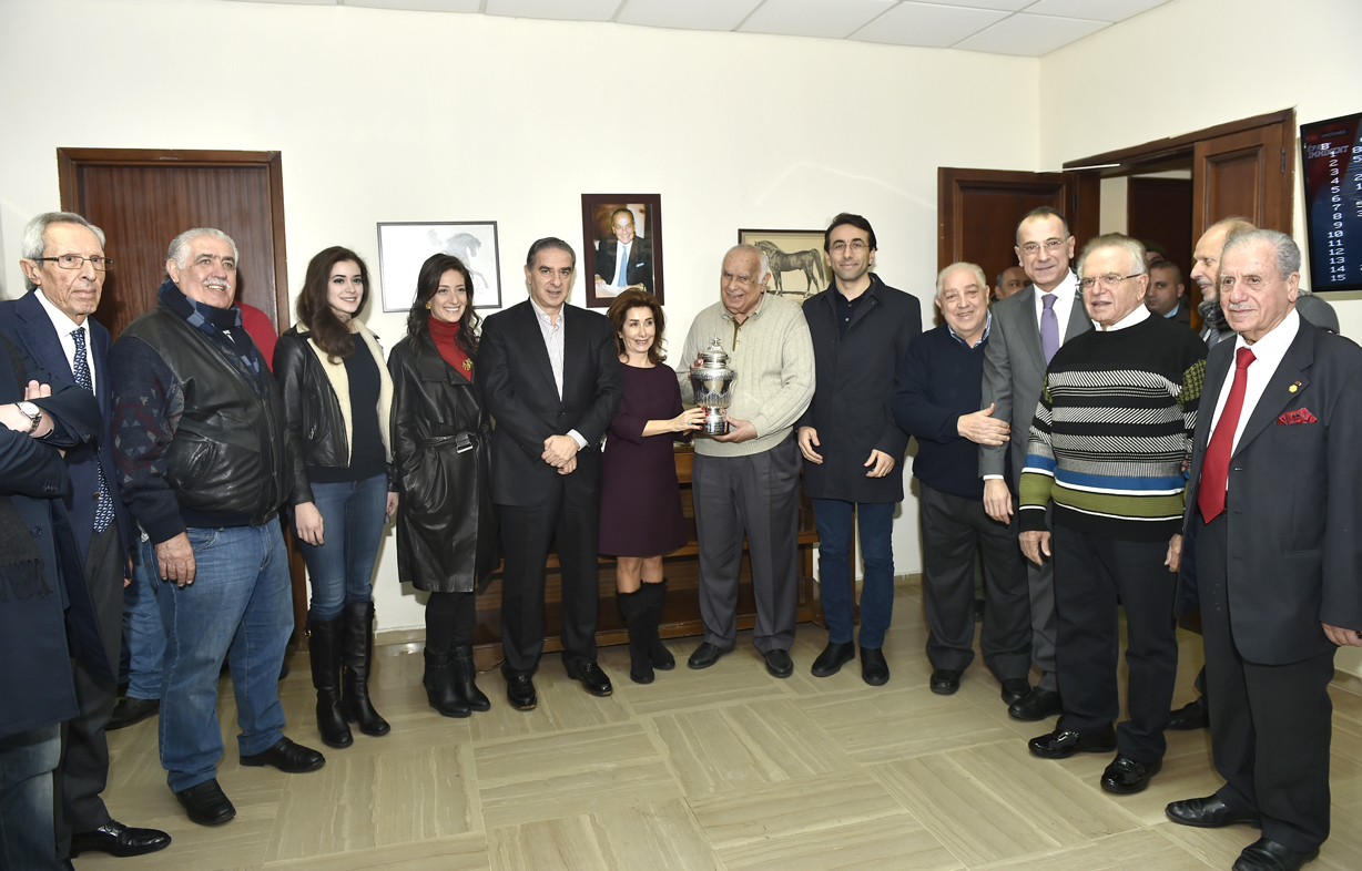 بدوره سلم المحافظ شبيب والسيد جميل ابراهيم كأس اختتام فعاليات المئوية الأولى الىرئيس جمعية حماية وتحسين نسل الجواد مفيد دبغي صاحب الجواد "أبو السيوف" الفائز في سباق تلك الجائزة .