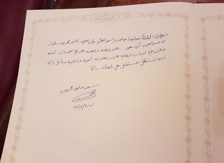 زار رئيس الحكومة سعد الحريري سفارة المملكة العربية السعودية في مقرها في بيروت، حيث هنّأ القائم بأعمال السفارة بتولي الأمير محمد بن سلمان ولاية العهد.