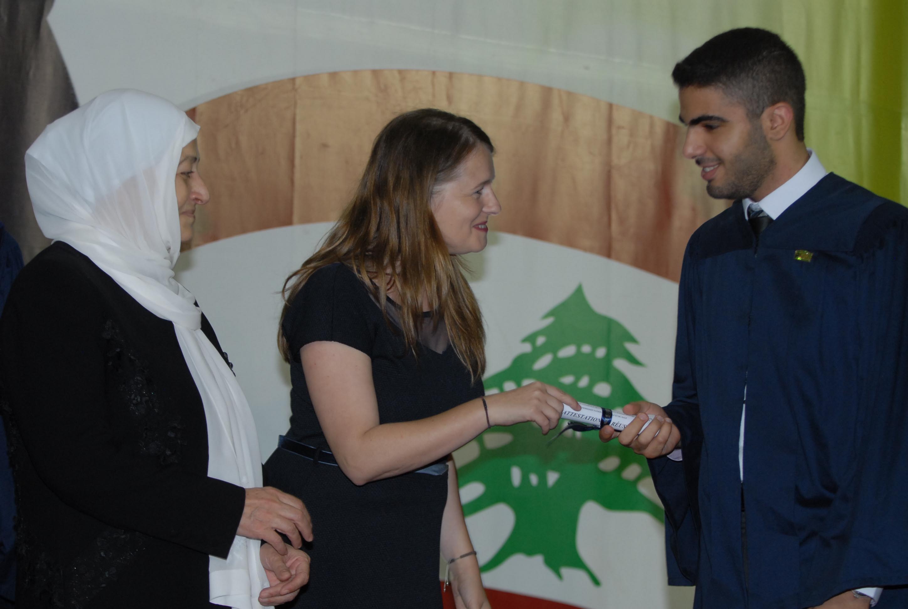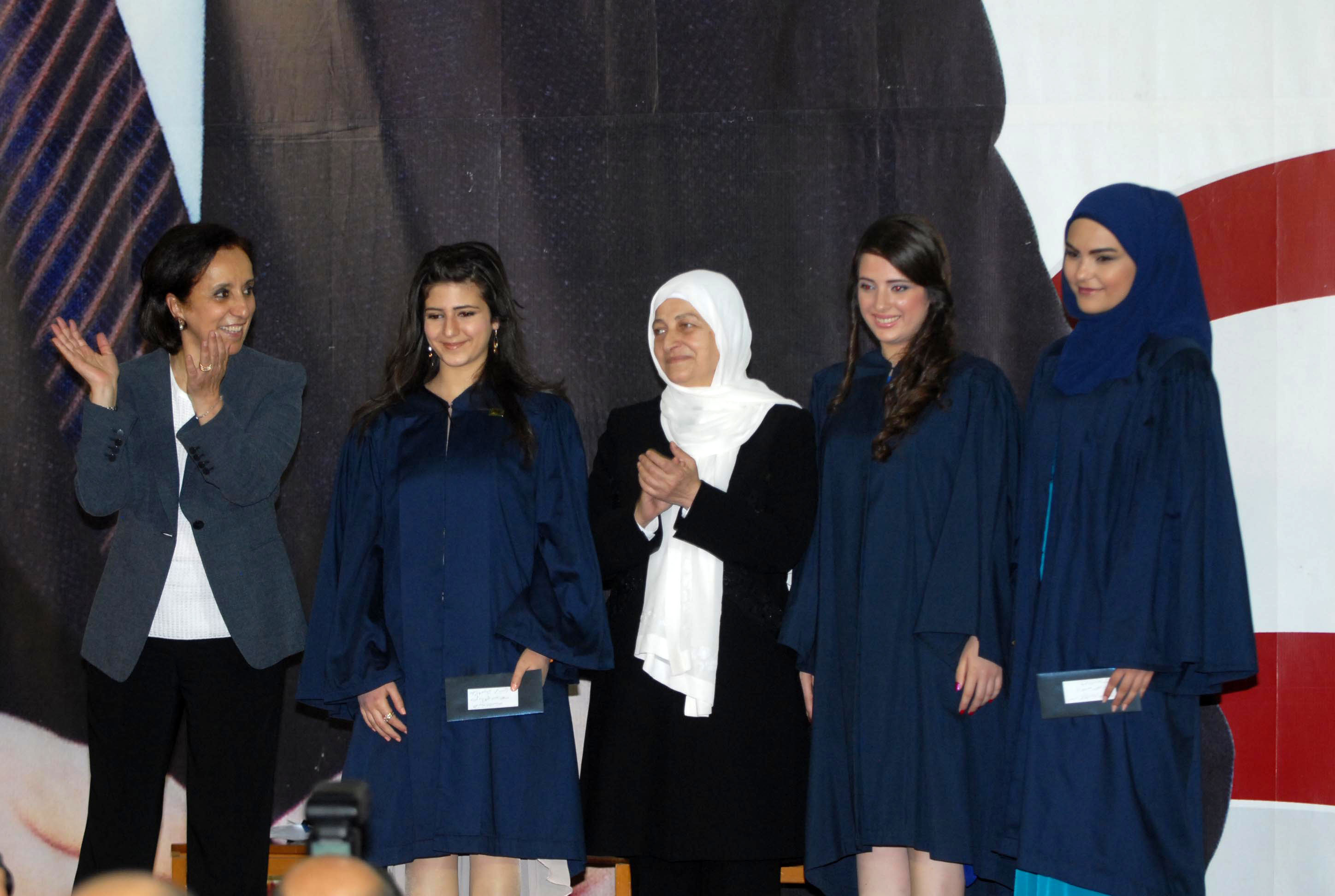 ثم كانت كلمات بإسم الخريجين القتها باللغة العربية ناديا وليد السبع اعين، وباللغة الفرنسية ريتا عزات ابراهيم، وباللغة الانكليزية محمد وسام فواز ، قامت بعدها الحريري بمشاركة المديرة الزين بتوزيع الشهادات على الخريجين والجوائز على المتفوقين .