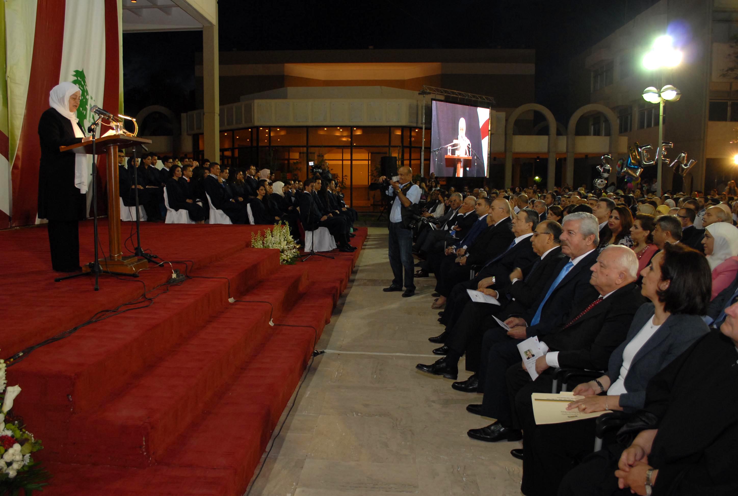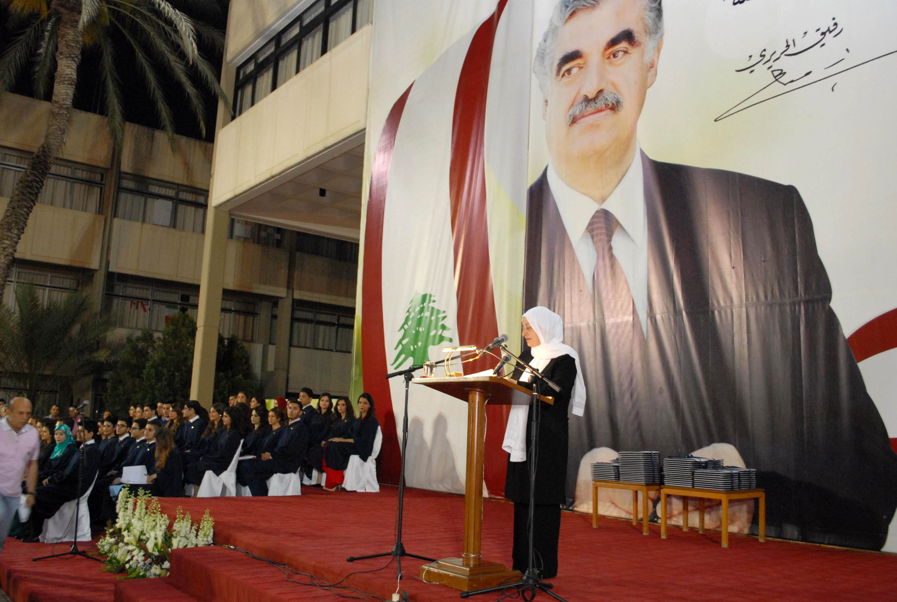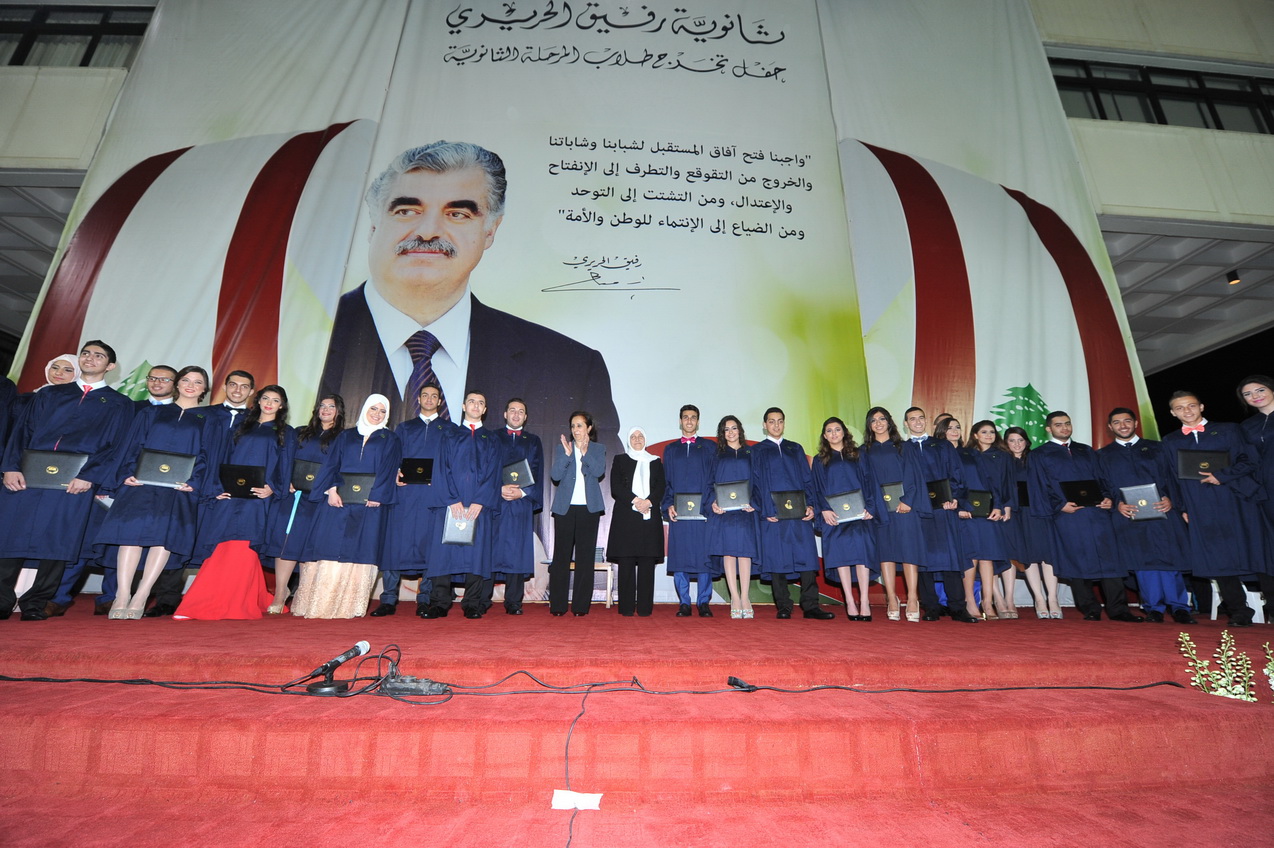 الحفل الذي حضره ممثل الرئيس سعد الحريري عضو المكتب السياسي لتيار المستقبل الدكتور حسن منيمنة تميز بتهنئة خاصة للطلاب من السيدة نازك رفيق الحريري نقلتها اليهم مديرة الثانوية رندة درزي الزين التي مثلتها في الاحتفال. فيما استهلت النائب الحريري كلمتها في الحفل بنقل تحيات وتهنئة الشيخ بهاء الدين الحريري الى الخريجين، واكدت اننا على خطى الرئيس الشّهيد رفيق الحريري وفي مدرسته لا نجد سبيلاً للخروج من واقعنا المرير إلاّ بالتّعليم والعمل..ولم تخف الحريري القلق على وطننا واستقرارنا من إرتدادات النّزاعات التي تحيط بنا..وقالت: نجدّد قلقنا من عدم إنتخاب رئيس للبلاد يعيد الإنتظام العام وعمل المؤسسات ولا نجد سبباً لعدم إتمام هذه العملية الوطنية وقد أتممنا قبل أيام عاماً كاملاً من الشغور الرئاسي في البلاد ..