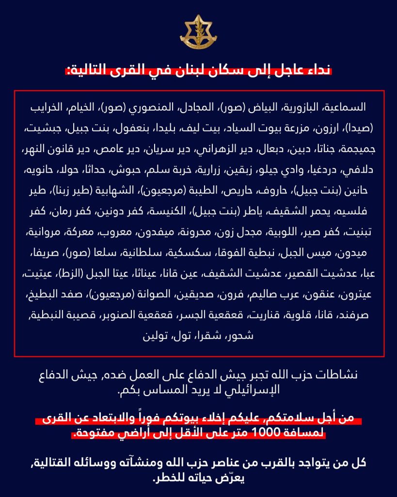 أصدر المتحدث باسم الجيش الإسرائيلي أفيخاي أدرعي إنذارًا جديدًا يطلب فيه من سكان عدد من القرى الإخلاء فورًا.