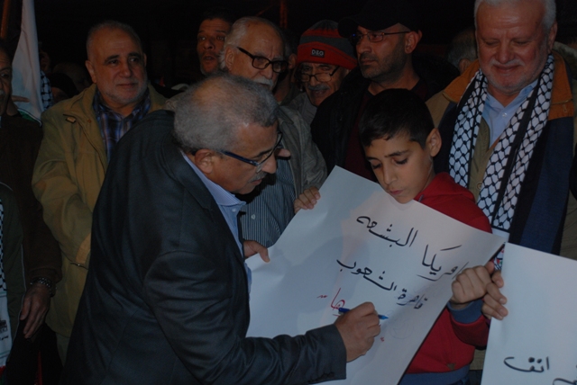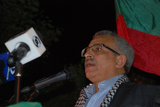 "من صيدا العروبة ... صيدا المقاومة... من ساحة الزعيم جمال عبد الناصر ... من صيدا الأبية ... نتوجه بالتحية إلى أبطال فلسطين ... إلى المنتفضين في القدس والضفة الغربية وأراضي ال 48 وكل فلسطين ... كما نتوجه بالتحية لشعب فلسطين في الشتات هنا في لبنان وفي عين الحلوة ... هذا الشعب الأبي الصامد الذي يواجه قوى العدوان وقوى الاحتلال وهو مرفوع الرأس شامخاً يتطلع لأن يرفع أطفاله الأبطال علم فلسطين فوق أسوار القدس. فتحية لهذا الشعب وعطاءاته ولما يقدمه من أجل فلسطين ومن أجل القدس ومن أجل عزة هذه الأمة وكرامتها. فلسطين عربية وستبقى عربية... نحن لا نراهن على أنظمة الخزي والعار... ونحن نعرف أن هذه الأنظمة لم تقدم لشعوب أمتها أي عزة وأي كرامة، بل هذه الكرامة والعزة التي نعيشها هي بسبب التضحيات التي قدمتها الشعوب المناضلة... "