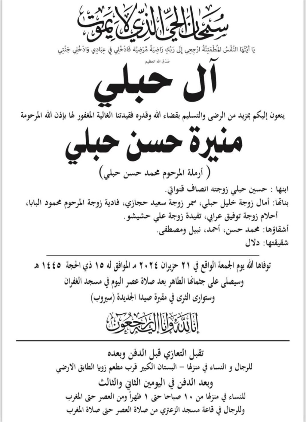وفاة منيرة حسن حبلي، الدفن عصر يوم الجمعة في 21 حزيران 2024