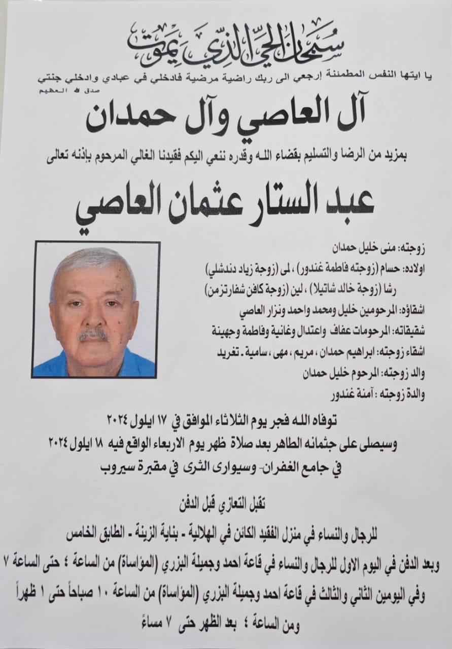 وفاة عبد الستار عثمان العاصي، الدفن ظهر يوم الاربعاء 18 ايلول 2024