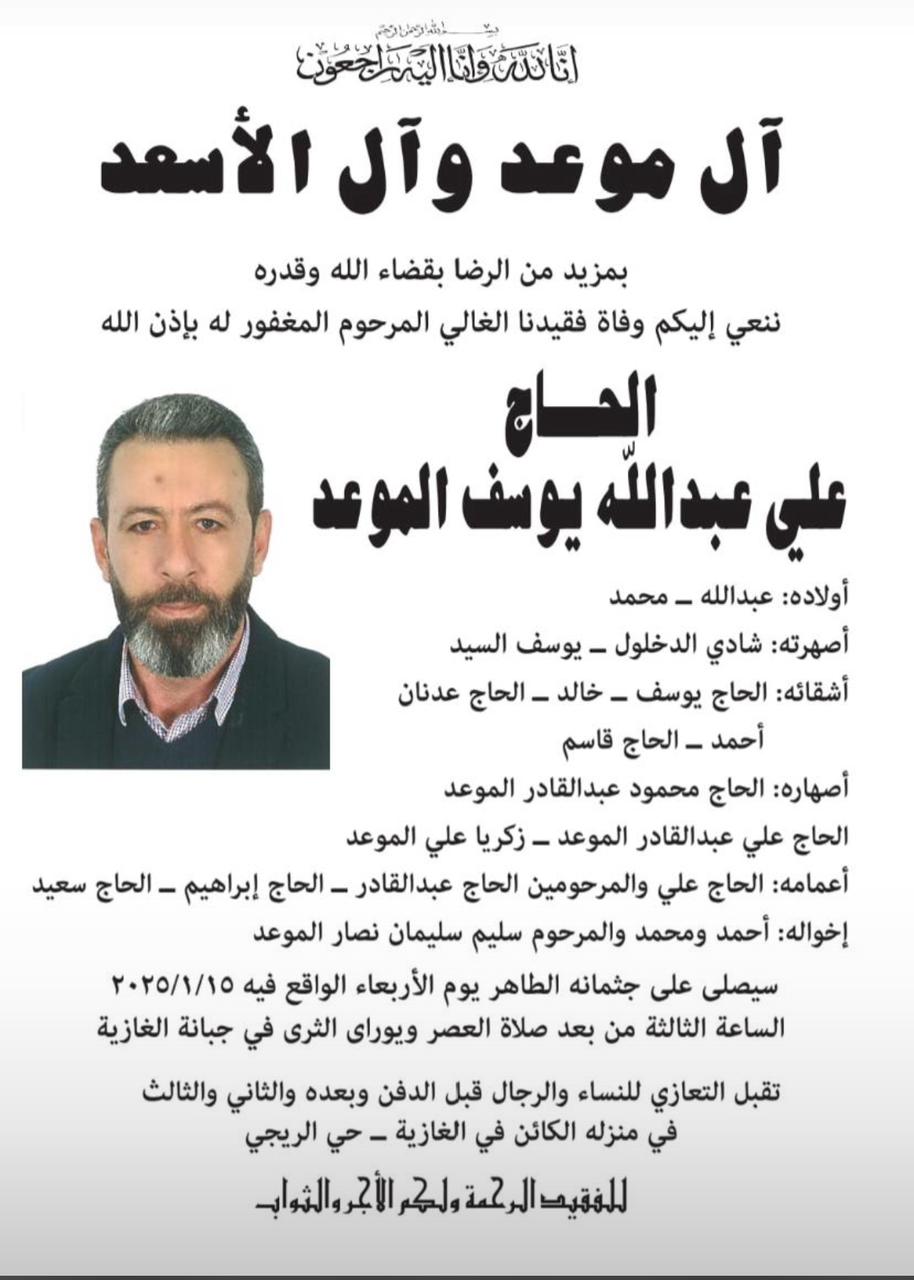 وفاة علي عبدالله يوسف الموعد، الدفن عصر يوم الاربعاء في 15 كانون الثاني 2025